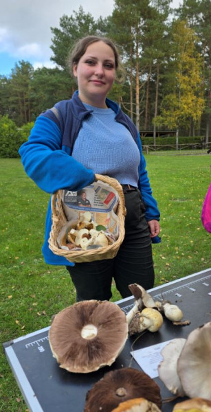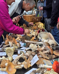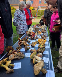An den Ausstellungstischen, auf denen die Musterpilze mit informativen Kärtchen versehen auslagen, konnten die gesammelten Exemplare verglichen werden. Jeder Korb wurde von Lothar Strelow gesichtet und es gab die eine oder andere negative Überraschungen, weil sich giftige Pilze unter die vermutlichen essbaren Exemplare gemischt hatten.