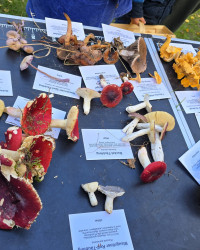 An den Ausstellungstischen, auf denen die Musterpilze mit informativen Kärtchen versehen auslagen, konnten die gesammelten Exemplare verglichen werden. Jeder Korb wurde von Lothar Strelow gesichtet und es gab die eine oder andere negative Überraschungen, weil sich giftige Pilze unter die vermutlichen essbaren Exemplare gemischt hatten.